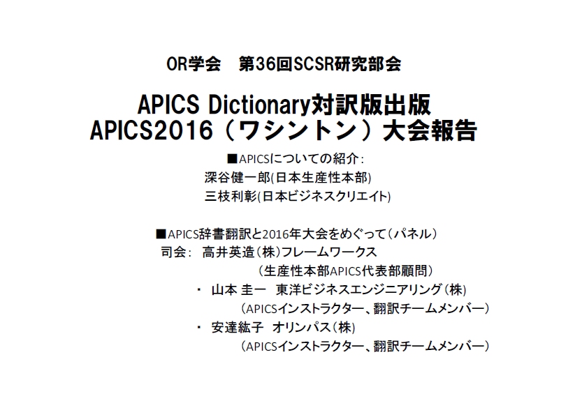 また、APICSの定義は国際的な標準用語となっているため、その用語4200語を網羅したAPICS Dictionaryはグローバルな意思疎通において欠かせないという観点から、日本でAPICSのインストラクター資格を持っている方々によって翻訳を行い、英和対訳版の出版にこぎつけました。その辞書のご披露と、期待効果、翻訳の苦労などをお話しします。