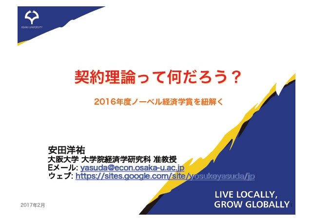 2016年度のノーベル経済学賞が与えられた「契約理論」について、その基本的な考え方を解説し、最近の社会システムにおけるその意味を考察します。「契約」には、社会的な立証が可能な変数の値に応じて異なる結果を指定するような契約を事前に書くことができる「完備契約」と、そのような細かい契約を事前に完全には書くことができない「不完備契約」があります。それぞれのケースについて、理論だけではなく対応する事例に触れながら概観します。